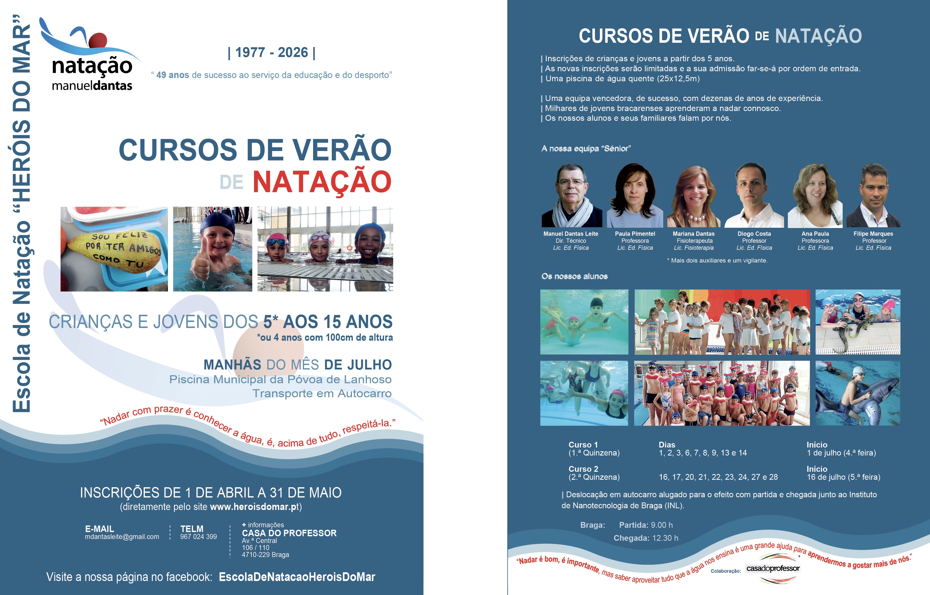 A escola de natação “HERÓIS do MAR” assenta num projeto educativo de desenvolvimento pessoal de crianças e jovens dos 4 aos 16 anos de idade, cujo foco da actividade é a aprendizagem da natação e o aperfeiçoamente técnico dos seus diferentes estilos. Em paralelo, desenvolve e vivencia com os seus alunos ações ligadas à criação de hábitos saudáveis na alimentação, à defesa do ambiente e à sustentabilidade do planeta, bem como à promoção de atividades de índole cultural e desportiva, atuando de forma inovadora e experiente na área do ensino e desenvolvimento da educação.